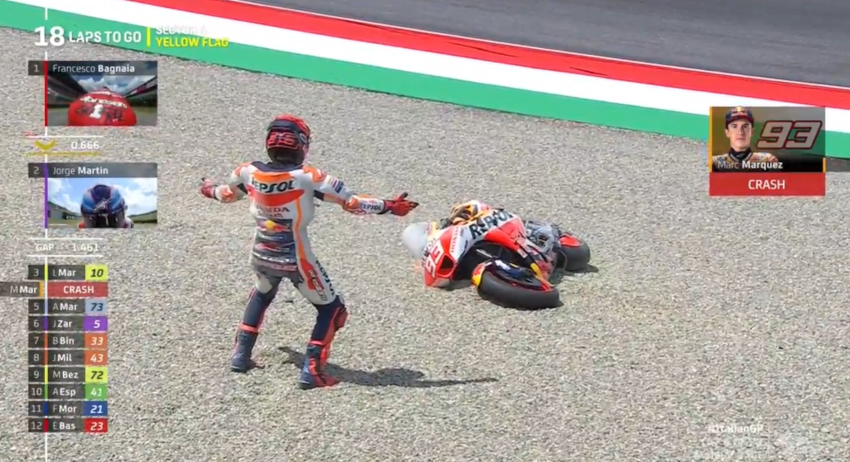 Marc Marquez had a tough day at the Italian Grand Prix, crashing out of the race while in contention for a podium finish. The Spaniard was running in the final corner and would see Marquez in Turn 15, when he lost the front end of his Honda, entering the final corner. He was able to walk away from the crash unharmed, but his race was over.
