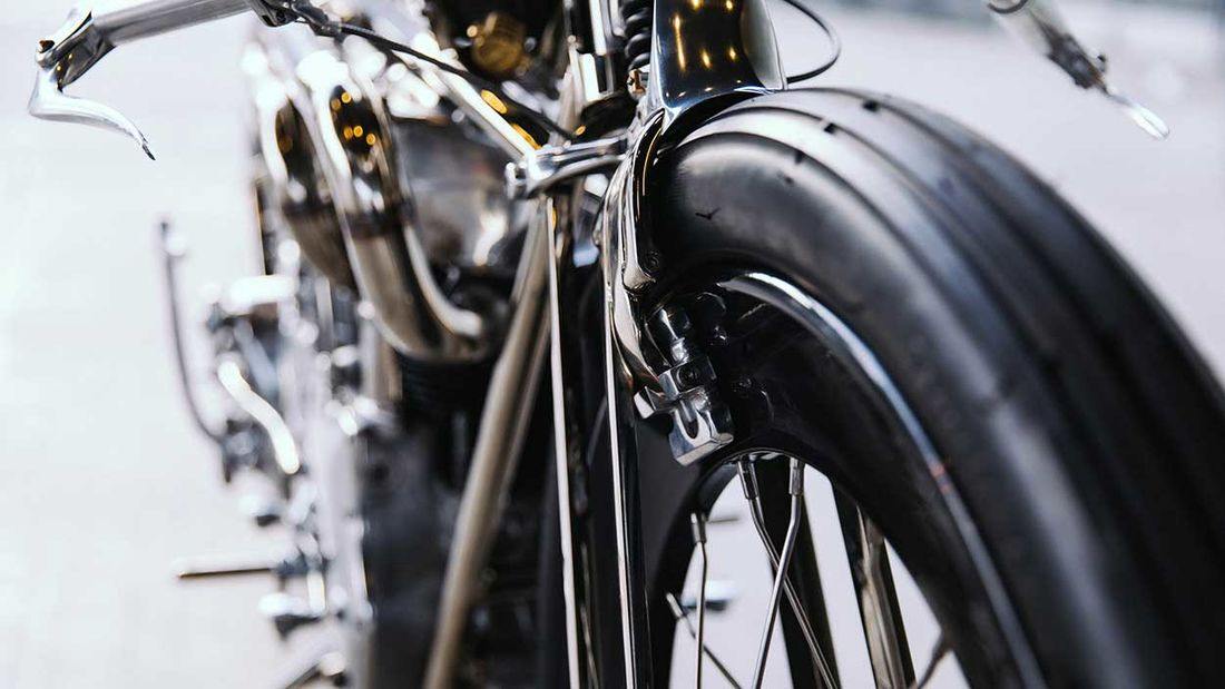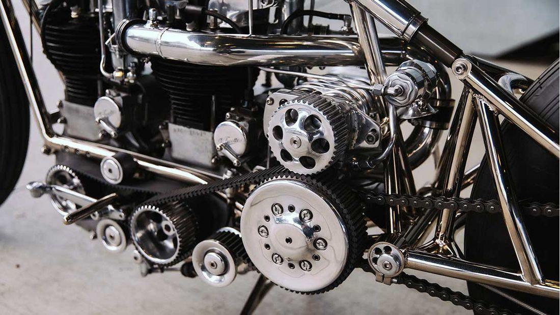 In short, we see the two Velocette cylinders, matchless four-speed gearbox and the Eaton supercharger all integrated with the help of a toothed belt.