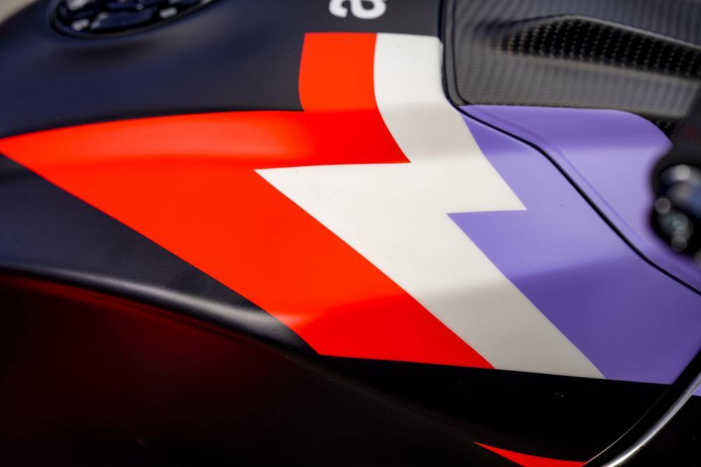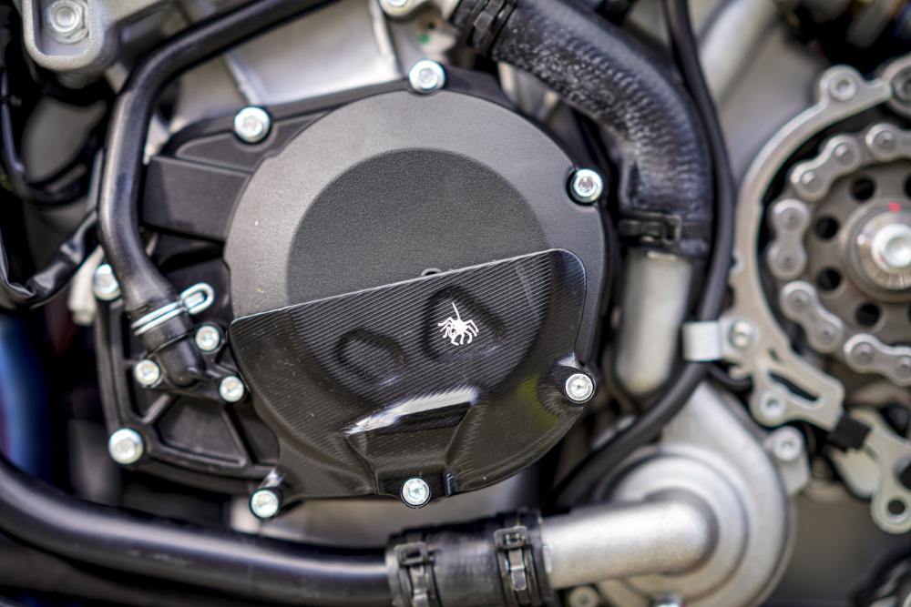 On the other hand, visible are carbon tailpipe and titanium manifolds in the unique Akrapovic exhaust.