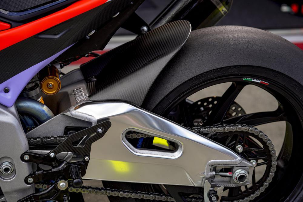 We can also see other high-end components like the Marchesini forged rims and of course, the engine comes from the unit which the RSV4 1100 factory to has.