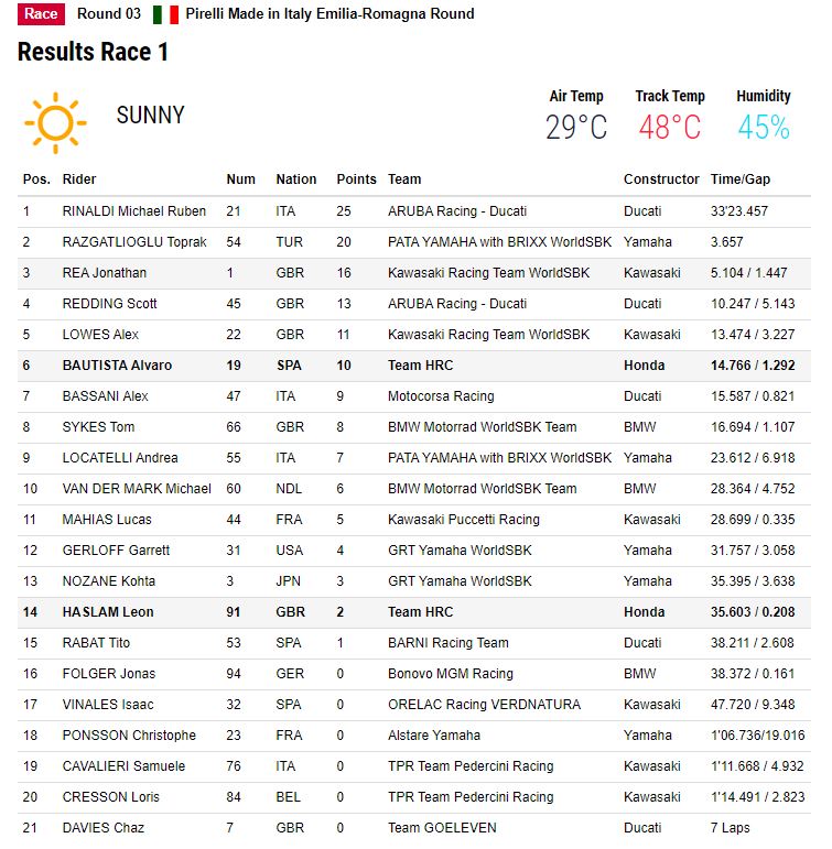 Haslam, who suffered an electrical problem with his bike, could not progress and finished this first race weekend in fourteenth place.