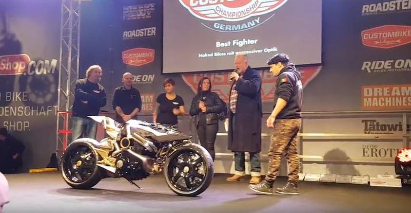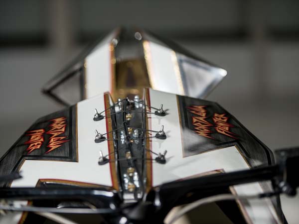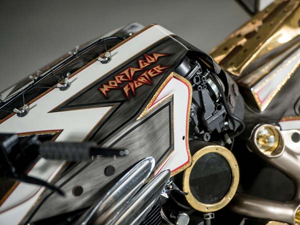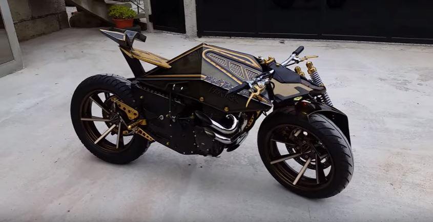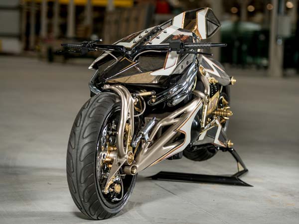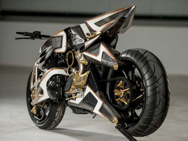 Carlos himself had build its bodywork and it took him 1.5 years to complete it.Electronics are been used from Suzuki and there are no changes. Paint job combines two colors gold and white and thick golden lines across the white paint area looks aggressive and gives a light tint to the entire motorcycle. Dimensions of tyres are 120-55 section tyre at the front and a 190-65 at the rear.