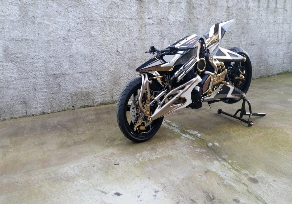 Carlos himself had build its bodywork and it took him 1.5 years to complete it.Electronics are been used from Suzuki and there are no changes. Paint job combines two colors gold and white and thick golden lines across the white paint area looks aggressive and gives a light tint to the entire motorcycle. Dimensions of tyres are 120-55 section tyre at the front and a 190-65 at the rear.