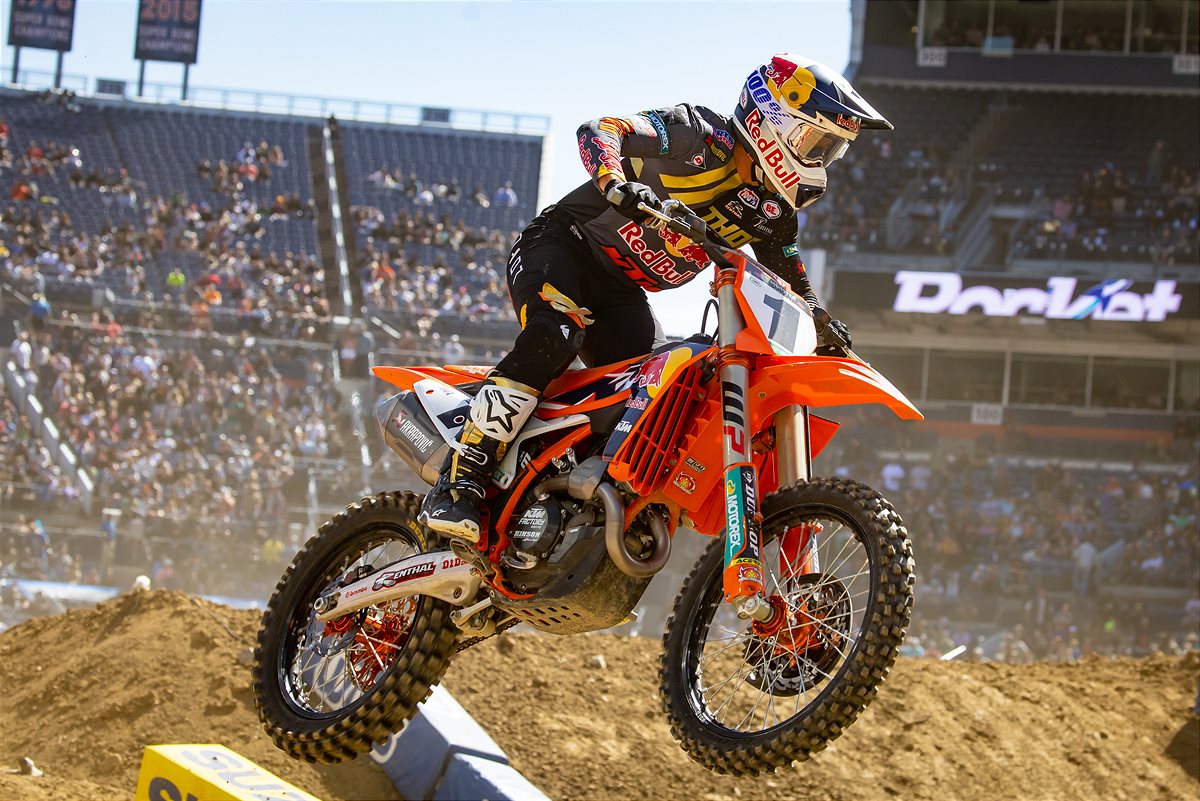 He got a top-five start in 450SX Heat 1, and he quickly ignited his KTM 450 SX-F FACTORY EDITION into third early on. He moved into second halfway through the race, putting on a solid charge in the final laps to finish just shy of the heat-race win.