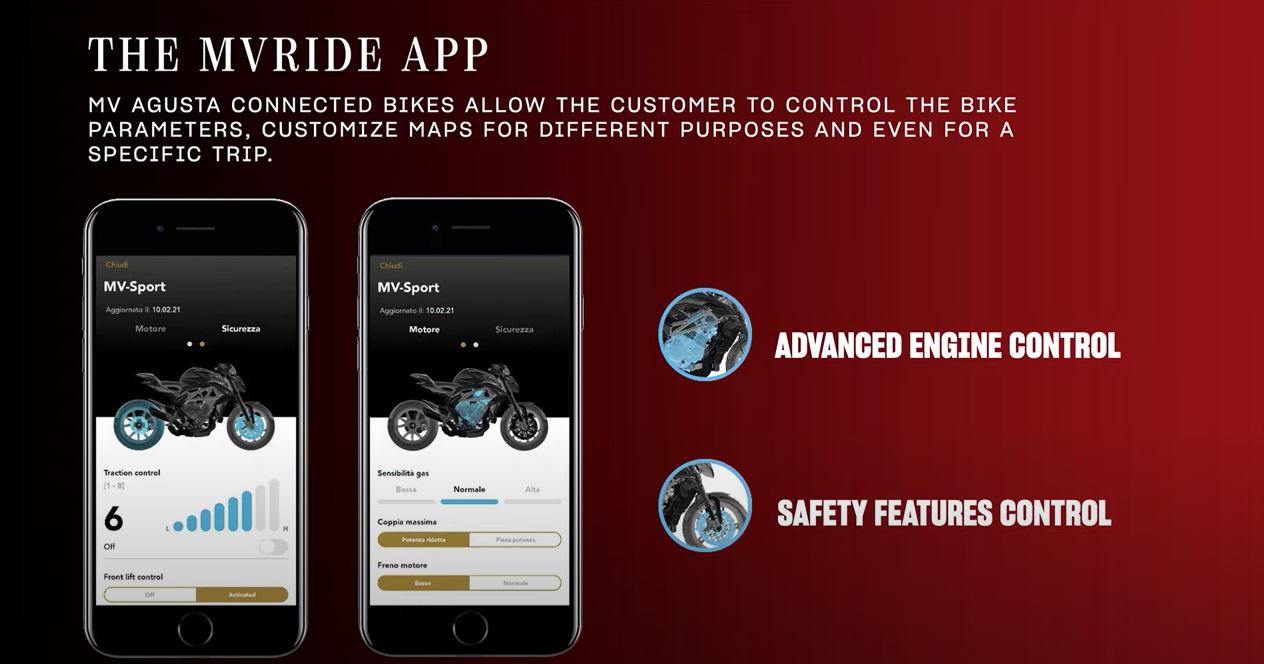 The MV Agusta works with unique 5.5 inch TFT display with integrated Bluetooth connection with integrated GPS module located on the motorcycle. These components are working together are in direct contact with the MV Ride app.