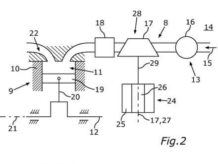 A new patent shows the compressor (28), driven by an electric motor (24), pushing air into the combustion chamber (11) via an intercooler (18).