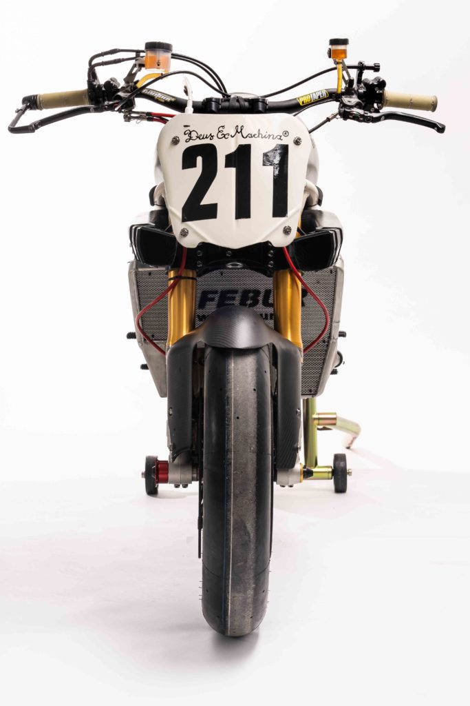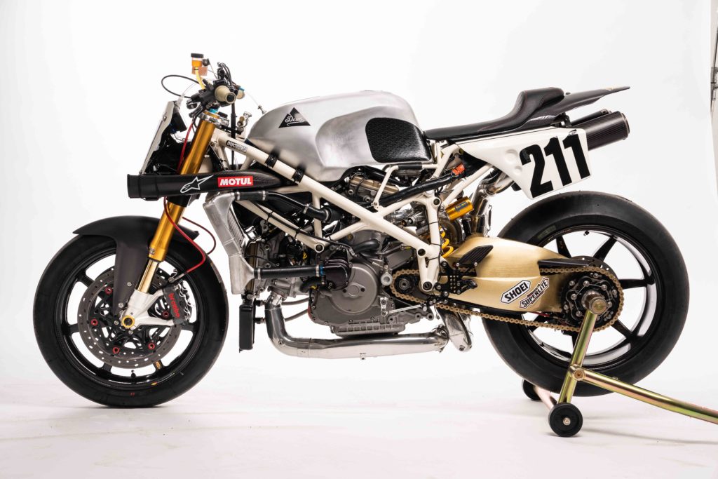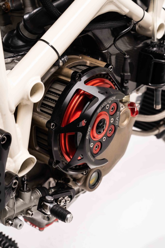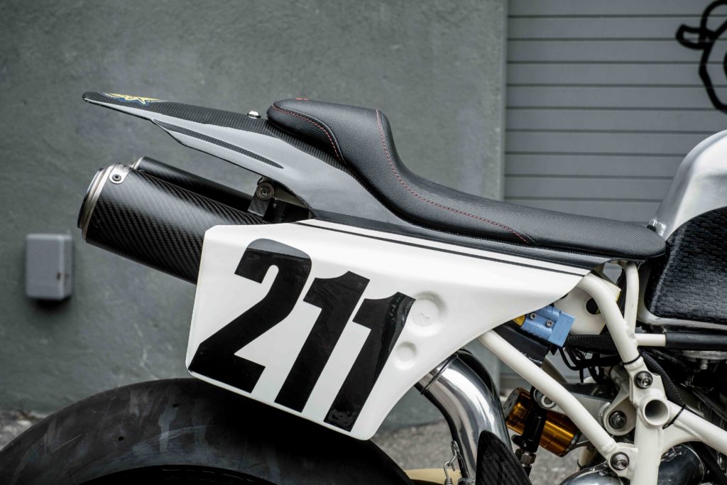 The Hyper SP frame was substituted with Ducati Street Fighter with a welded-on head tube from a 999. The gas tank is thin and holds around 3 gallons of fuel the reference point used for the tank was Mark Marquez’s Honda GP.