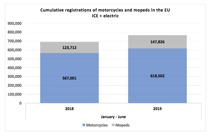 Combined registrations of electric mopeds, motorcycles and quadricycles reached 35,810 units during the first six months of 2019. This represents a substantial increase of 70% compared to the registration levels of the first half of 2018 (21,062 units).