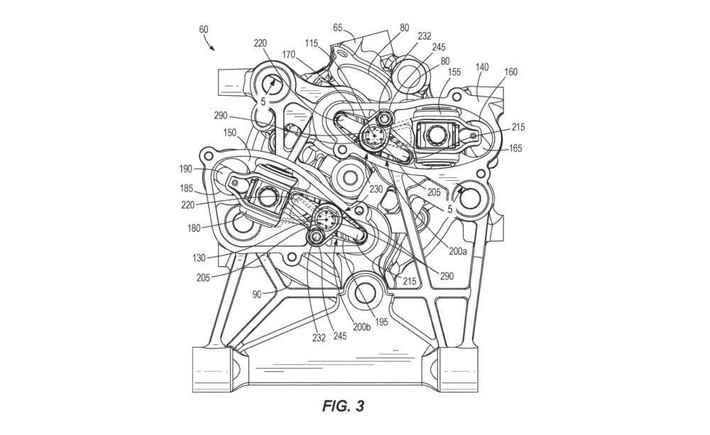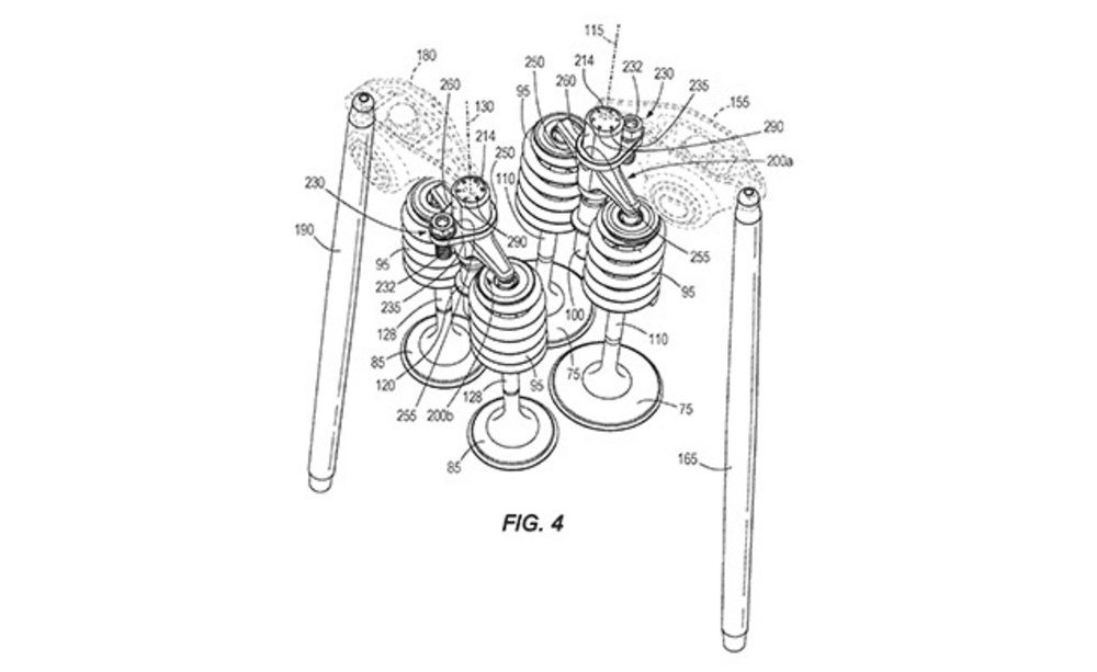 A patent does the omit the usage of the traditional rod and rocker platform that Harley uses in 114 cubic inch engine. However, Harley has introduced a jumper that connects the two-way valves, with a single rocker to operate them.
