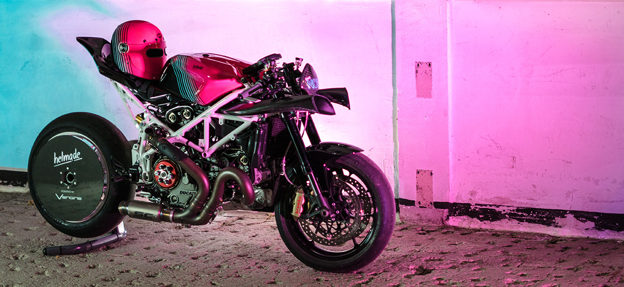 Inspired by movies like ‚Blade Runner‘ or ‚Ghost In The Shell‘ the young helmet design company helmade has completely reworked a race-track built Ducati 999S from the Berlin custom builder Vengine and, together with a custom Bell Bullitt, transformed it into a cineastic highlight. As you would expect it from a company focussed on helmet design, the helmet is unique worldwide.