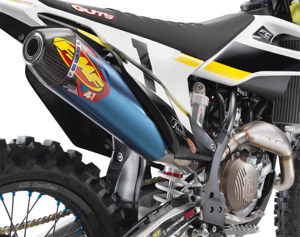 The hydro-formed, laser-cut and robot-welded frame is expertly constructed to harness specifically calculated parameters of longitudinal and torsional flex and features an increase in rigidity resulting in improved rider feedback, energy absorption and stability. - Exhaust : The Factory 4.1 RCT Muffler incorporates the latest in FMF Resonance Chamber Technologyâ„¢ both internally and externally and features a blue anodized titanium muffler body with a carbon end cap. In addition, it offers a shorter overall length that is less susceptible to damage and moves the muffler closer to the engine to centralize mass.