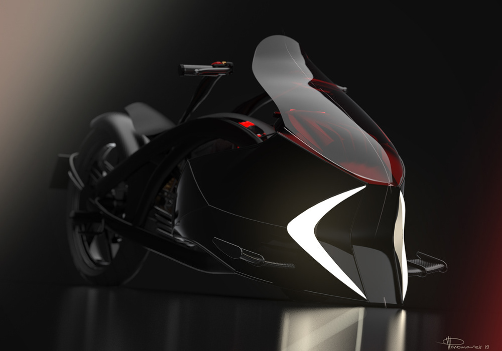 The concept has two main colors involved in it red and black which does a good justice with front having little white.The design is futuristic as the rider will have to lean to ride the bike.