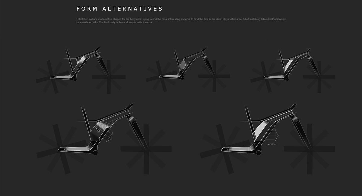 Fabian says “When he began sketching, his personal vision was to design the iPod of eBikes: A bulky block with minimal design features and a bright colour palette. It didn’t really work the way I intended, and I got bored of it awfully fast”.