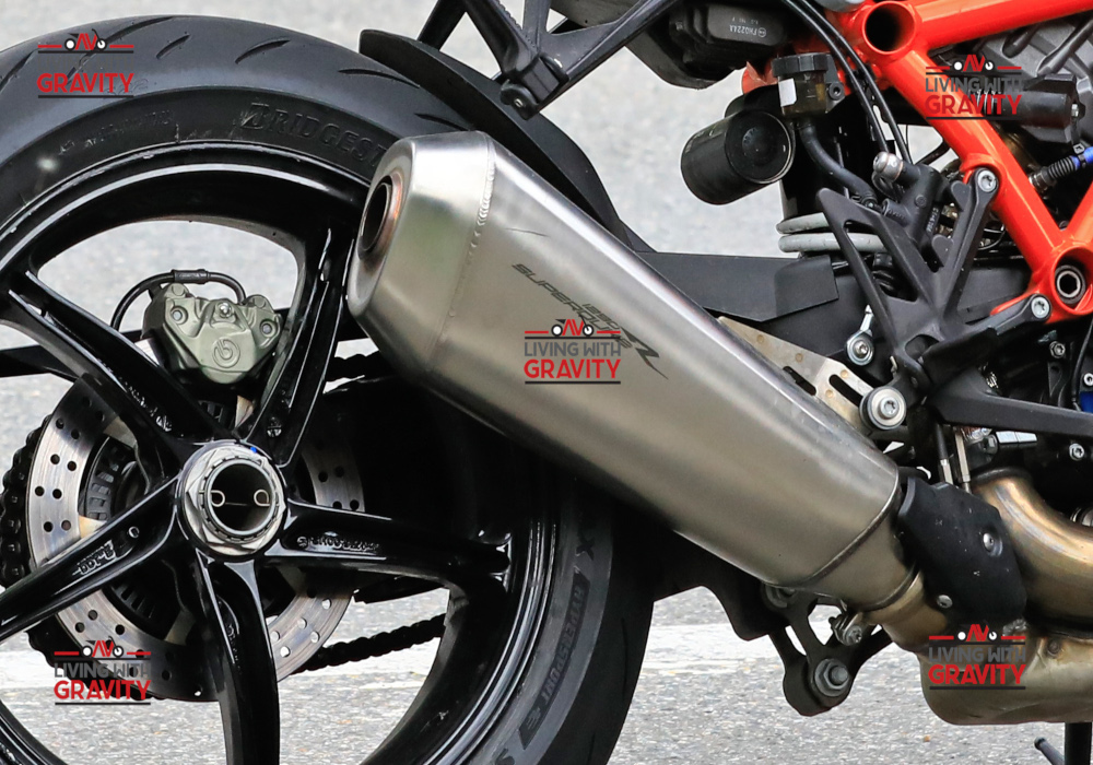 The test driver had to stop with his prototype at a mountain road in the European Alps which is currently closed for motorbikes. That gave us the opportunity to take a close look at the new KTM 1290 Super Duke R while it was parked. On the exhaust the 1290 Super Duke R lettering can be seen.