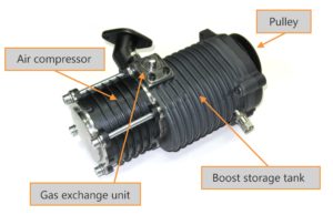 Our supercharger consists of 4 main units: (a) air compressor, (b) boost storage tank, (c) gas exchange unit, and (d) drive pulley.