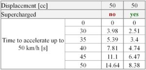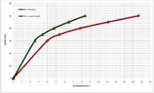 As the diagram shows, the 50cc supercharged motorbike has an acceleration time of 8.5 seconds to reach 50 km/h speed.  The stock model reaches the same speed in 14.5 seconds.  Thus the time to reach maximum allowed speed for supercharged motorbike is less than that of the naturally aspirated stock motorbike by 40%.  The target bike technical specification allows 50 km/h limit.