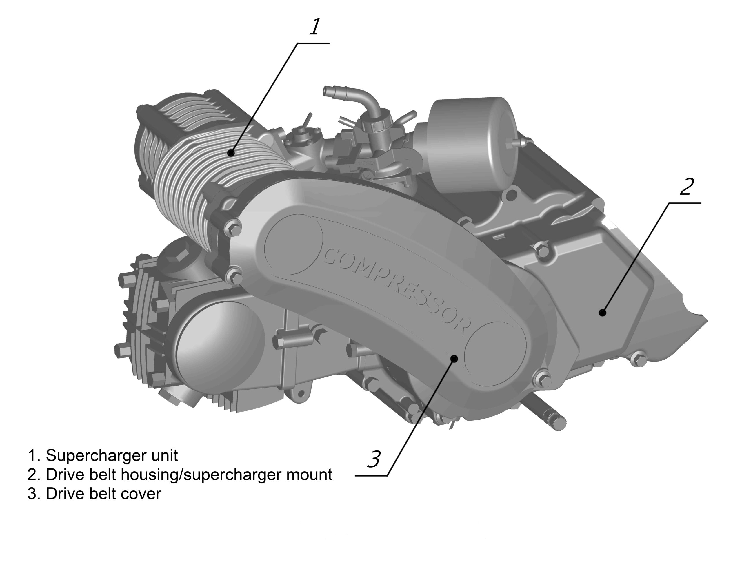 The supercharger drive (drive belt cover is off) layout is presented by the following 3D model