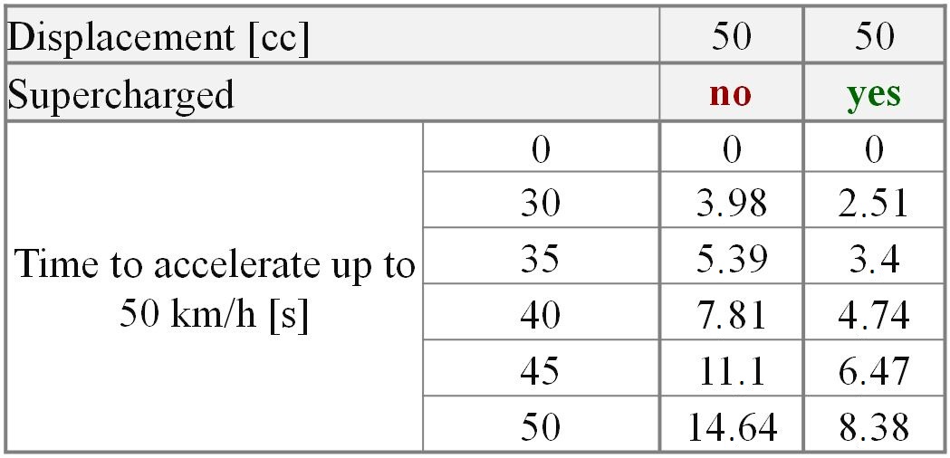 As the diagram shows, the 50cc supercharged motorbike has an acceleration time of 8.5 seconds to reach 50 km/h speed. The stock model reaches the same speed in 14.5 seconds. Thus the time to reach maximum allowed speed for supercharged motorbike is less than that of the naturally aspirated stock motorbike by 40%. The target bike technical specification allows 50 km/h limit.