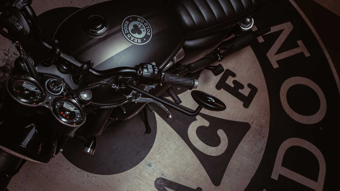- Ace Cafe branded Matt Storm Grey paint scheme with stripe, and range of additional unique blacked-out accessories, such as black engine badges and intake covers.