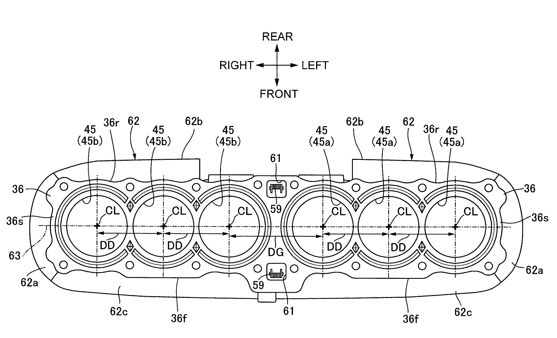 As shown below figure, the cylinder block 36 divides the cylinders 45 arranged side by side in the vehicle width direction. Here, six cylinders 45 are arranged. That is, a six-cylinder internal combustion engine is configured. ”