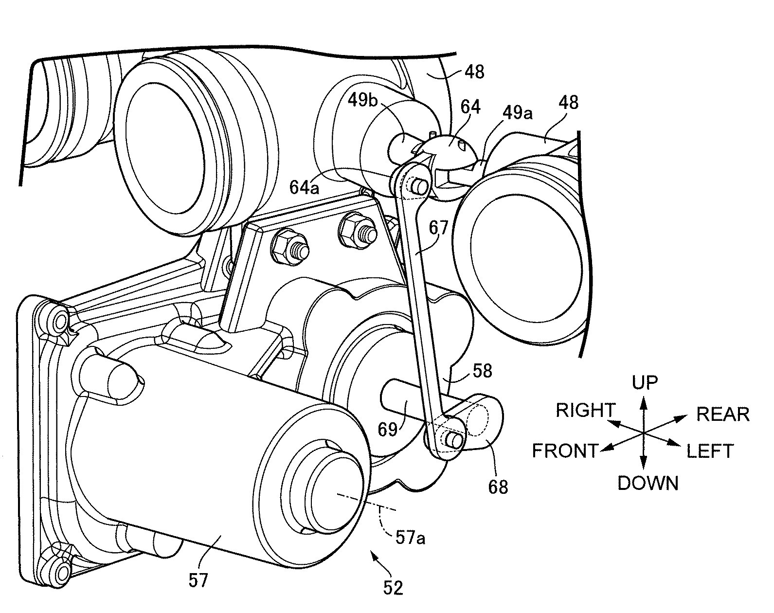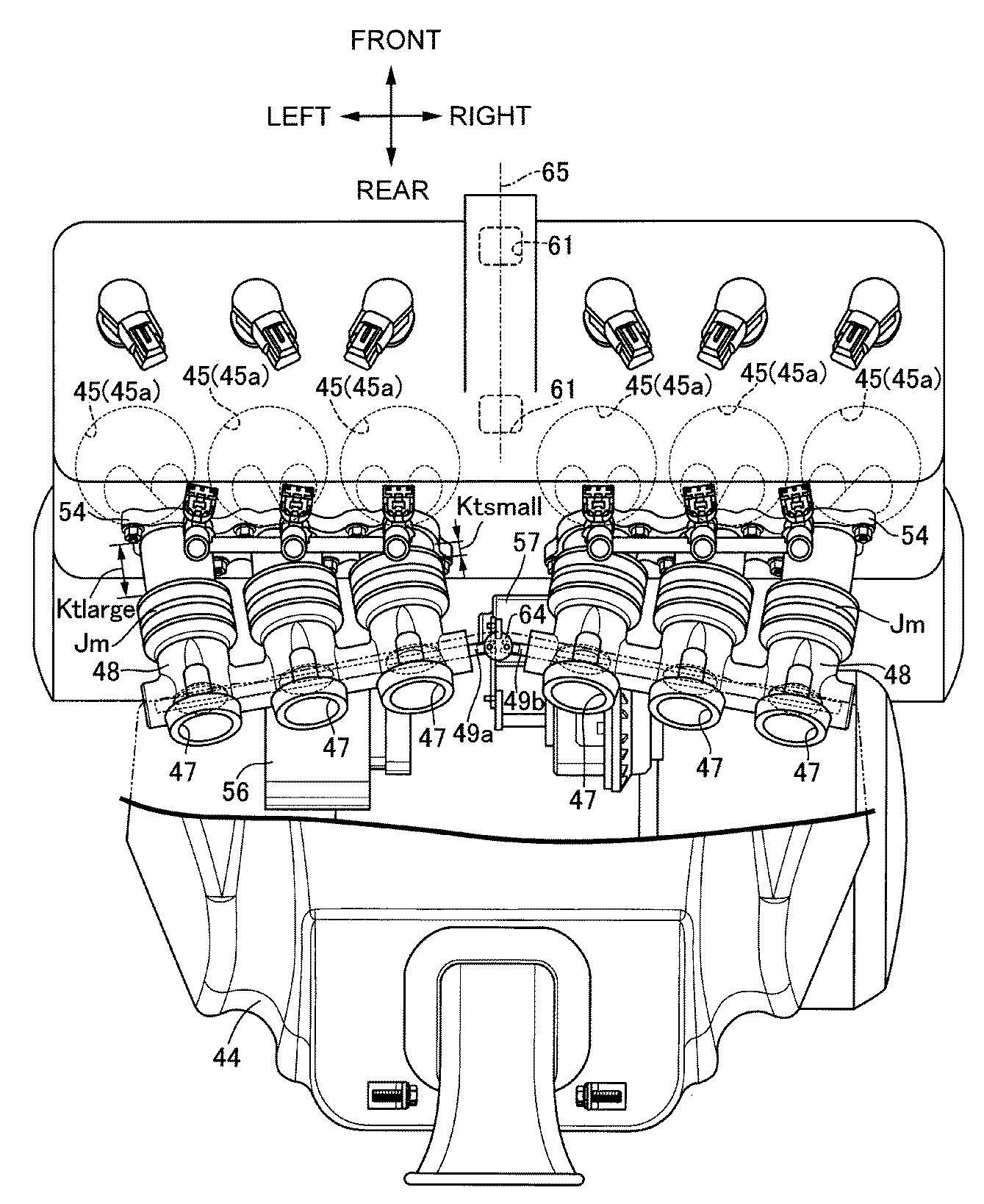 As shown below figure, the cylinder block 36 divides the cylinders 45 arranged side by side in the vehicle width direction. Here, six cylinders 45 are arranged. That is, a six-cylinder internal combustion engine is configured. ”