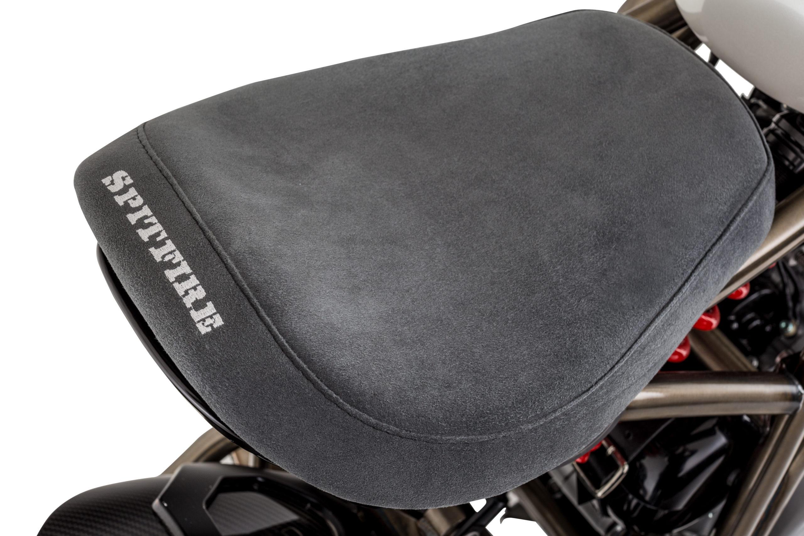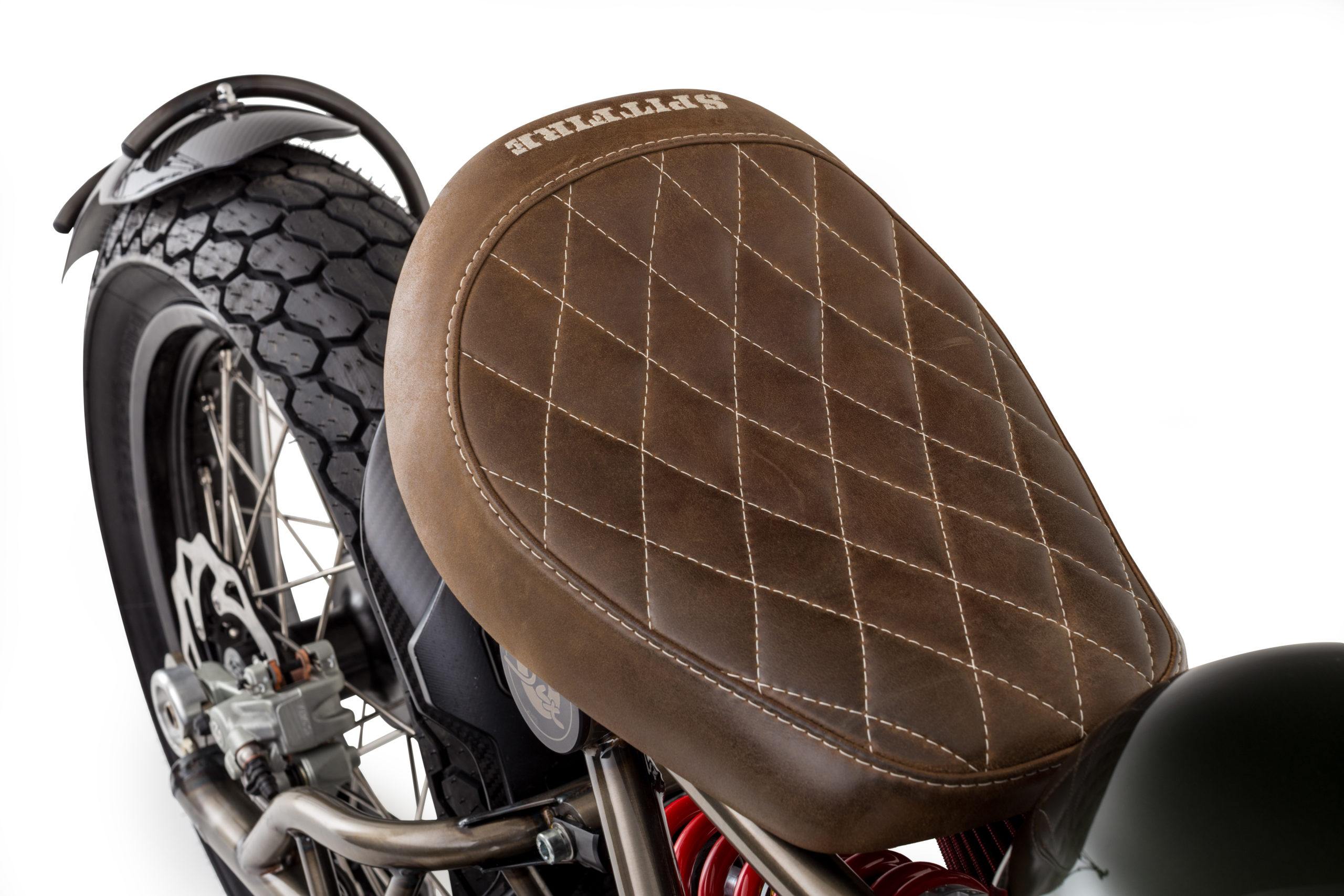 The Spitfire platform already stripped back and ready for some styling detail. The design team added a pair of machined clip-on bars, CNC-machined foot-controls, a hand-stitched leather saddle and carbon-fibre rear cowl.