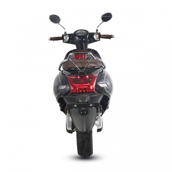 The 2hp approx 1.5 kW Bosch electric motor comes hub-mounted, making 45 km/h as top speed. The engine is coupled with the removable LG battery. The scooter weighs 92 kgs.