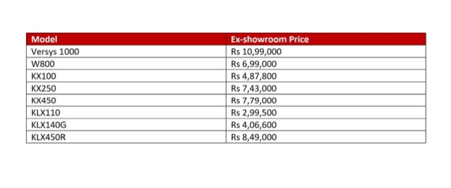 The list includes models like Versys 1000, W800 and the KX , KLX series. The price list was announced on social media channels.