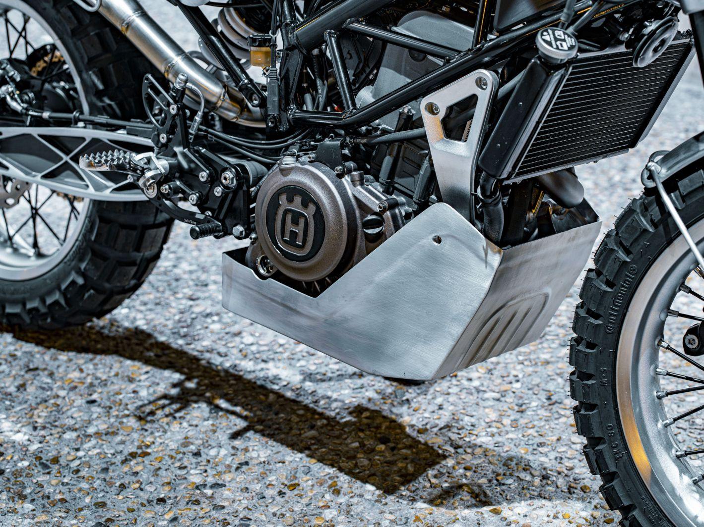 We added an aluminium skid plate was also brush-finished. Along with a custom muffler featuring an oval outlet and bespoke heat shield.