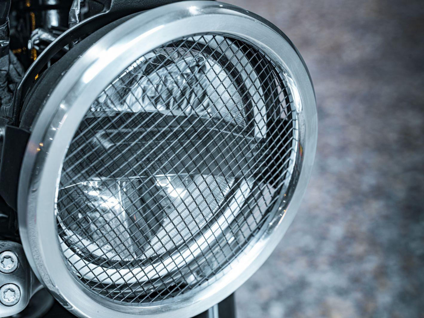 The team then fabricated a vintage-inspired headlight screen, using the factory headlight guard as a base/frame. It was brush-finished with a polished edging.