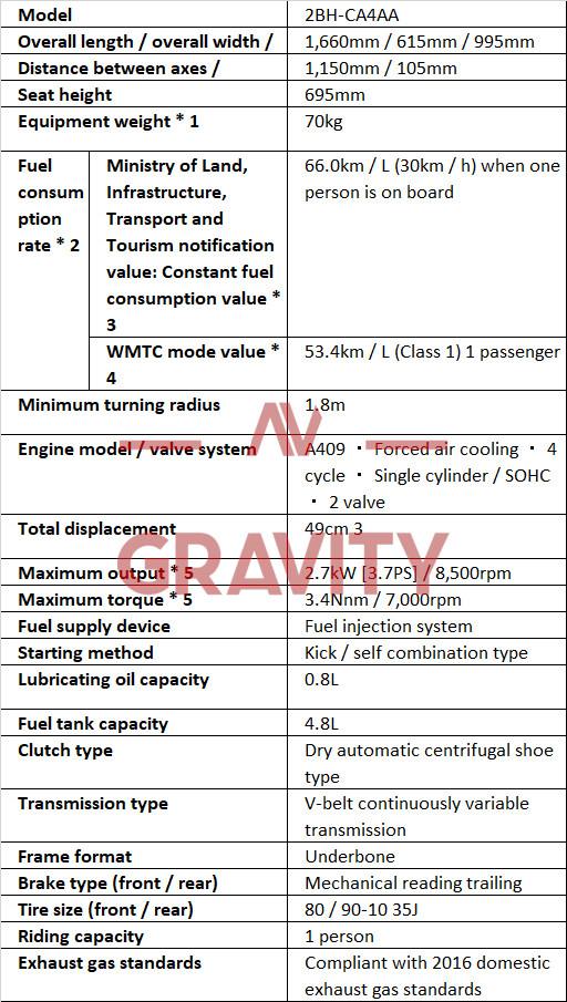 The 49cc, A409, forced air cooling, four-cycle, single-cylinder / SOHC with two valve makes 2.7kW [3.7PS] / 8,500rpm power and 3.4Nnm / 7,000rpm Troque.