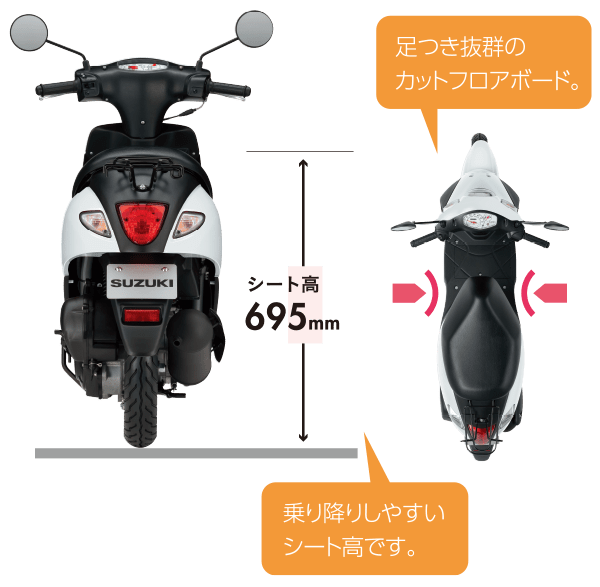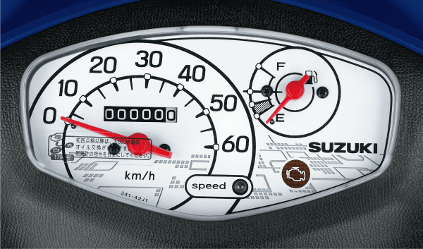 The 49cc engine comes with the Suzuki’s eco-performance (SEP) technology and adopts the air cool engine which is compact and light. Easy to use engine helps you commute to school, shopping, and a little ride.