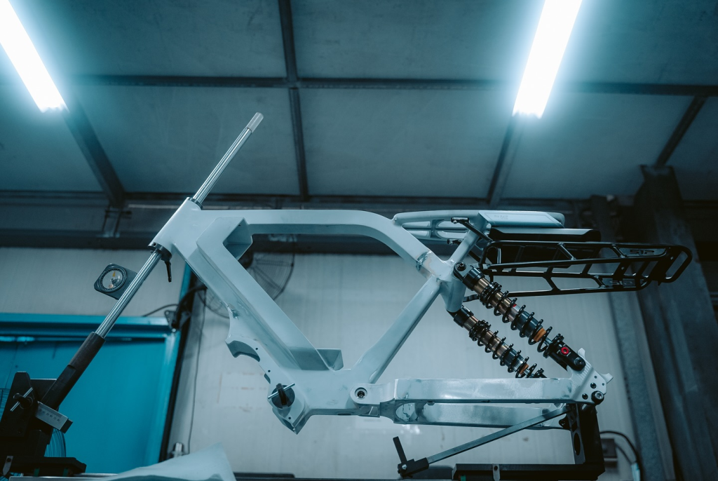 The bike’s suspension system absorbs shocks, providing a smooth ride over uneven surfaces.