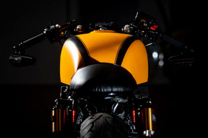 The seat had to be like the cafe racer. Therefore we see the new plain black seat, and consequently, the rear was brought down by 15mm. The handlebars come replaced with the short ones.