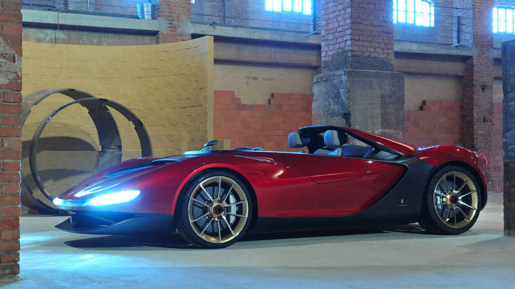 - Aerodynamics and Design: One of the most captivating features of the Sergio is its absence of a traditional windshield. Instead, it uses a unique aerodynamic deflector that diverts wind up and over the passenger compartment. This not only gives the car a distinctive look but also maintains the aerodynamic performance of a car with a windshield. The design also includes roll bars and floating aerodynamic headrests attached to them, further accentuating its unique silhouette.