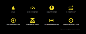A maximum speed of 20mph (32km/h) comes from a 300-watt (0.4hp) motor capable of climbing up to 12% grades, while built-in LED headlights to offer illumination at night.