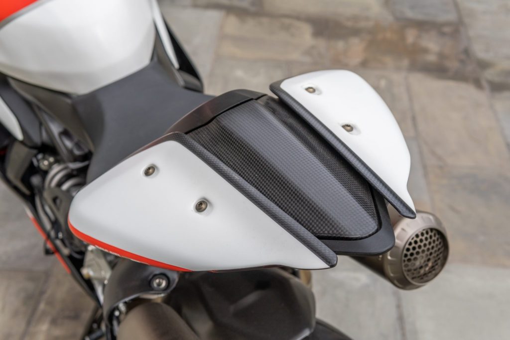The carbon-fibre fairings and aluminium fuel tank arrive finished in two-tone red. And white over an exposed carbon-fibre frame. Silver stripe accents the fuel tank, and plugs come fitted in place of the factory mirrors.