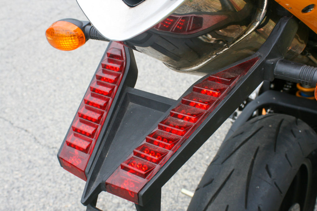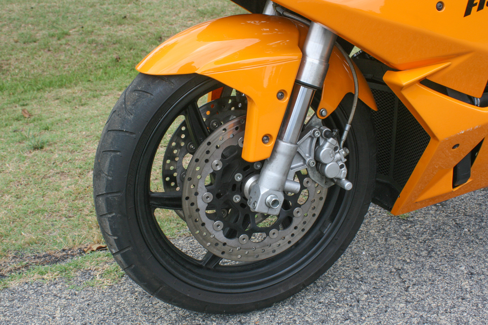 However, the brake discs were the same on the Hyosung GT650 Comet. However, they upgraded the lines to stainless units from Goodridge, and they changed the master cylinder to a Brembo unit.