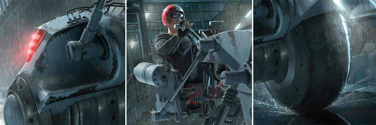 All this Photoshop work would be nothing without a very strong eyecatcher that dominates the scene. He found the “Monopod” in Doug Chiang’s book “Mechanika”, a futuristic designed one axis racer.