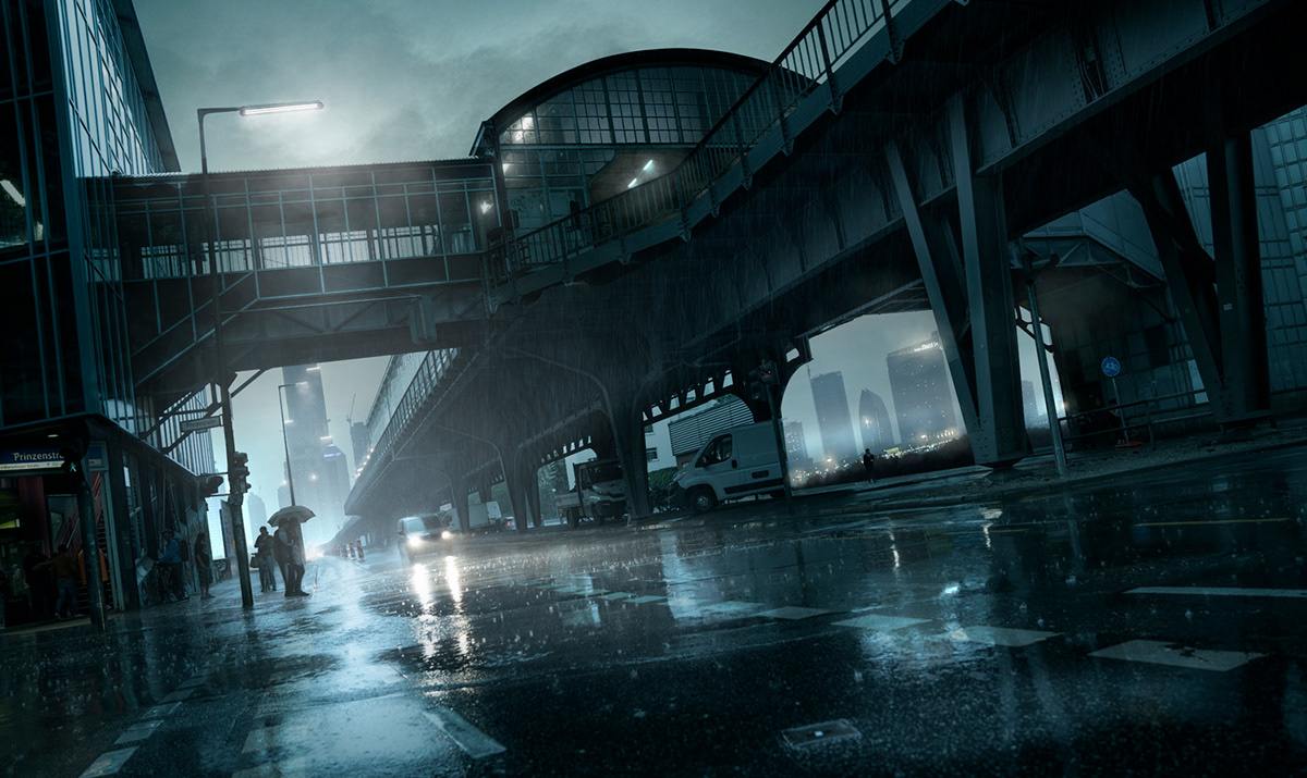 Finally, he came up with the idea to capture the shot in the pouring rain to add reflecting details that lead to a completely different experience when watching the scene.