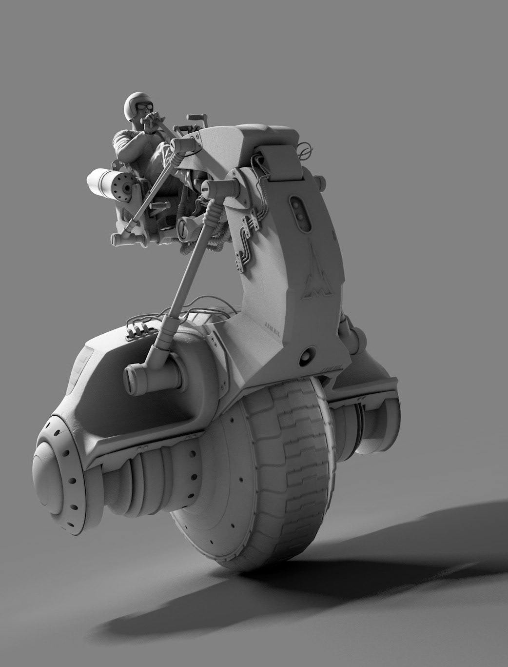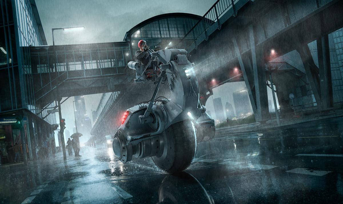 All this Photoshop work would be nothing without a very strong eyecatcher that dominates the scene. He found the “Monopod” in Doug Chiang’s book “Mechanika”, a futuristic designed one axis racer.