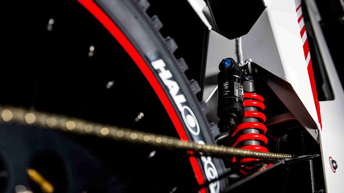 The electric motor is put in the frame at the top side. The frame is made up of aluminum sheets that are brought together. At the front, you will see Manitou USD fork, and the rear you will see shocks from Fox.