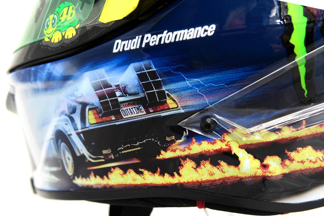 An extraordinary uniform for VR46’s AGV Pista GP R to commend the arrival to the Misano World Circuit close to his home. Propelled by the motion picture Back to the Future.