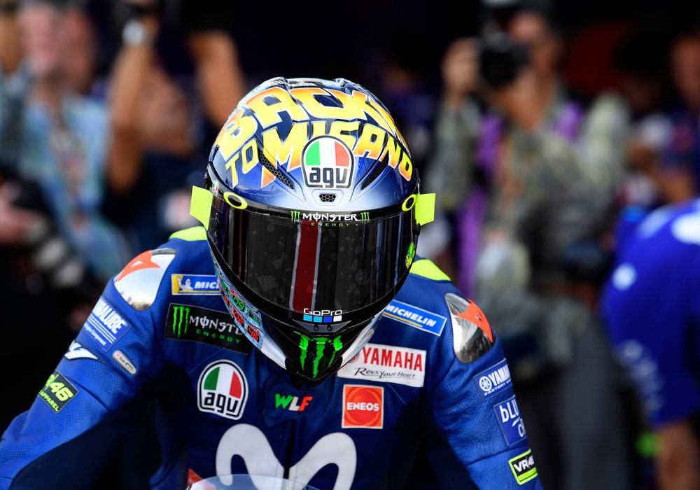 The highest point of his Pista GP R, the highest point of-the-line protective cap from the AGV dashing reach, features the lettering “Back to Misano” in vast yellow and orange content as a gesture to the Misano World Circuit Marco Simoncelli, Rossi’s home base.