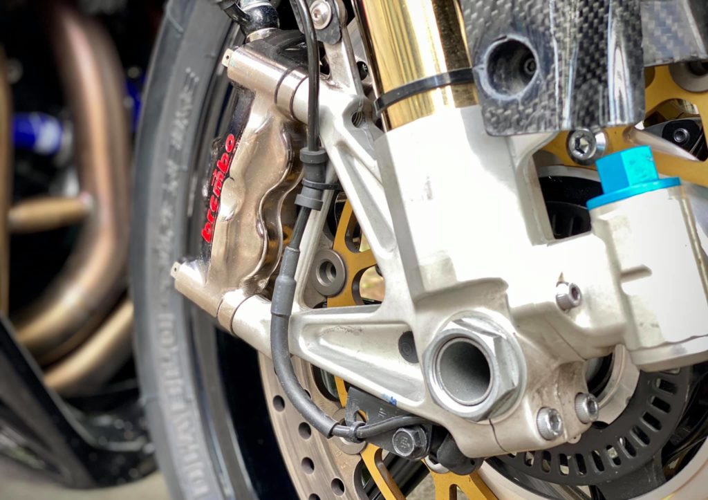 Not to mention the tank and rear mudguard further, we see Ohlins on both the ends, Brembo GP 4 RX and OZ magnesium rims.