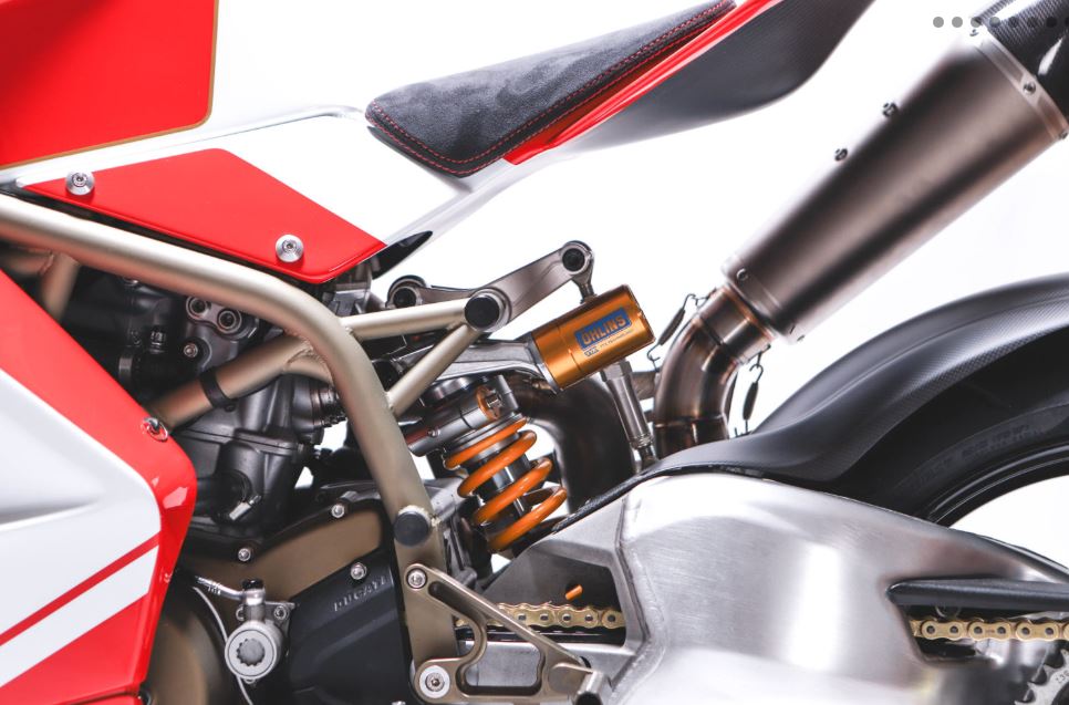Suspension – Ohlins FGR World Superbike forks, WSM-spec Ohlins TTX shock, 1098 rear swingarm