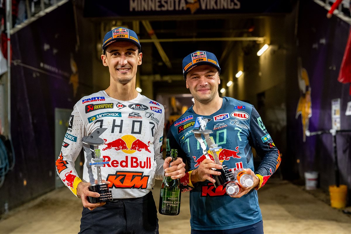 The Red Bull KTM Factory Racing team came away from Round 7 of the AMA Supercross Championship with significant momentum as Cooper Webb, and Marvin Musquin delivered a pair of podium finishes in Minneapolis. With persistent performances aboard the new KTM 450 SX-F FACTORY EDITION, both Webb and Musquin rode calm and collected to navigate their way through a hectic 450SX Main Event.