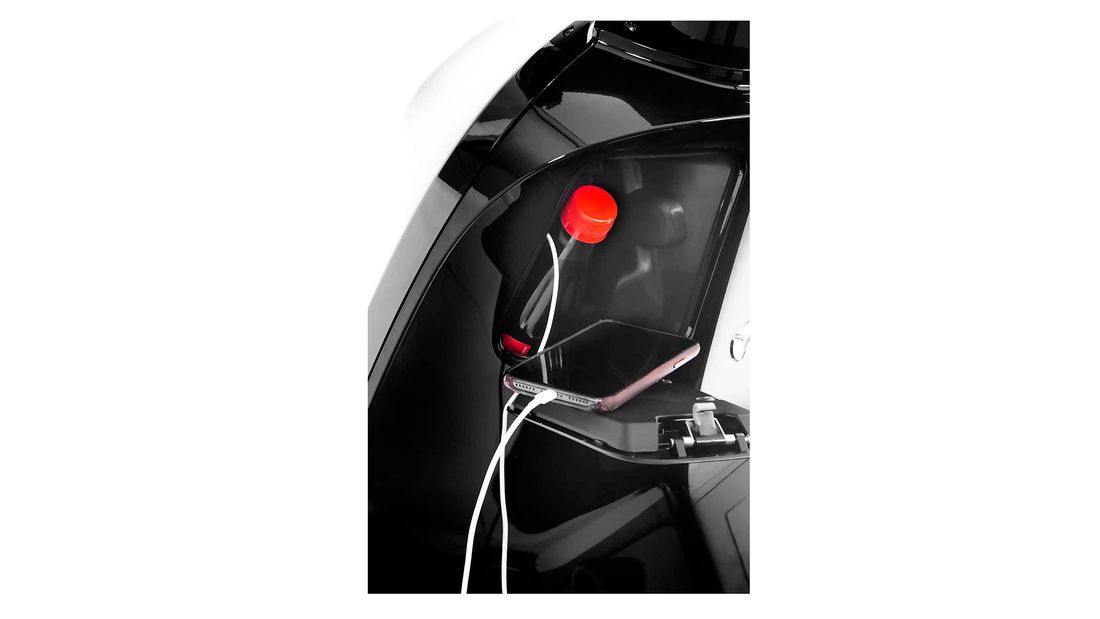 The smartphone can be connected and stowed in a compartment designed for storage with a USB port inside the front panel.Â