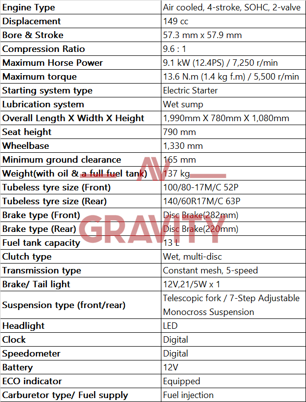 The motor comes integrated with 5-speed mesh transmission.With 9.1 kW (12.4PS) / 7,250 r/min power and 13.6 N.m (1.4 kg f.m) / 5,500 r/min Torque.